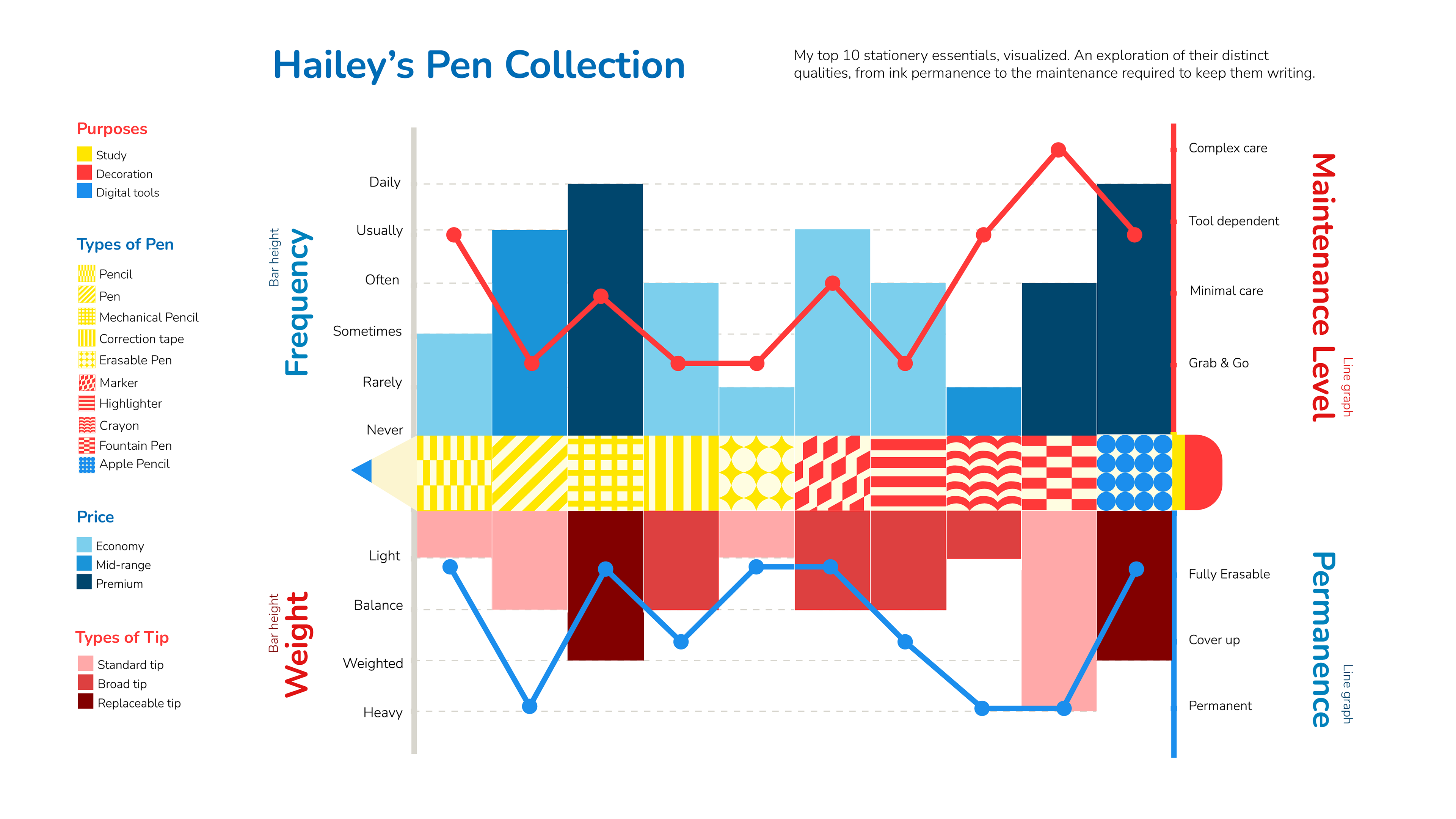 For this information design project, I was tasked with visually mapping out eight distinct characteristics of my personal pen collection. By integrating bar charts, line graphs, and a custom symbolic coding system, I simplified complex data into an easily digestible format. The primary goal was to draw readers in with an engaging layout and vibrant color palette while ensuring the core information remained logical.