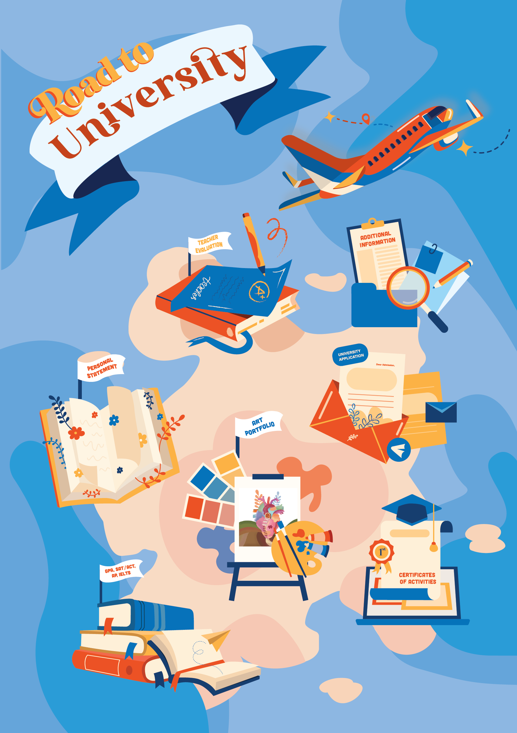 Serving as both a content contributor and visual strategist, I developed this journal to guide students through the study abroad application process. I established a bright, youth-oriented visual identity and crafted playful illustrations that made topics like essay writing and personal experiences feel inspiring rather than intimidating.